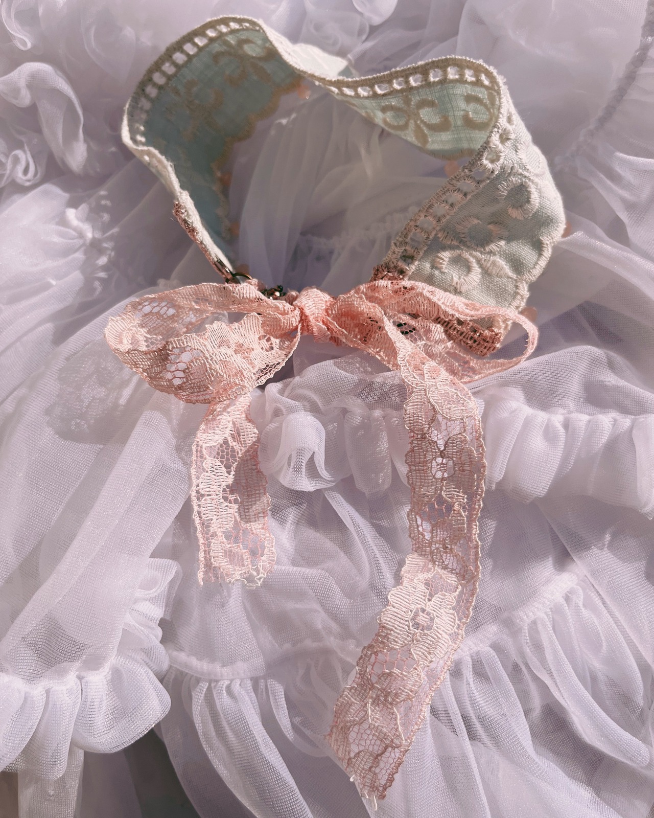 後ろで結ぶリボンは調整が可能なので、自分にぴったりのフィット感を楽しむことができます。お出かけや特別な日にぴったりの、魅力的なアイテムです。